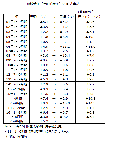 ●内閣府の基調判断は、15年12月分・16年1月分・2月分・3月分では「機械受注は、持ち直しの動きがみられる」で判断据え置きとなった。16年4月分では「機械受注は、持ち直しの動きがみられるものの、4月の実績は大きく減少した」と11月分と同じ表現になったものの、持ち直しに重点が置かれていて、実質的に7カ月連続の判断据え置きになった。5月分では「機械受注は、足踏みがみられる」へと8カ月ぶりに下方修正となった。前回6月分も「機械受注は、足踏みがみられる」で判断据え置きになった。今回7月分では内容がしっかりしていることを受けて「機械受注は、持ち直しの動きがみられる」になった。3カ月ぶりに「持ち直し」の表現が使われた。基調判断の上方修正は15年10月分以来9カ月ぶりである。