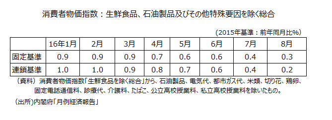 ●また、内閣府流のコア指数は、消費者物価指数・生鮮食品を除く総合から、石油製品、電気代、都市ガス代、米類、切り花、鶏卵、固定電話通信料、診療代、介護料、たばこ、公立高校授業料、私立高校授業料を除いたものだ。2015年基準の、内閣府流コア指数(固定基準)1~3月分の前年同月比は、+0.9%だったが、4月分以降伸び率が鈍化し、今回8月分は+0.3%まで鈍化した。2010年基準時代の13年10月分の+0.3%以来の低い伸び率である。