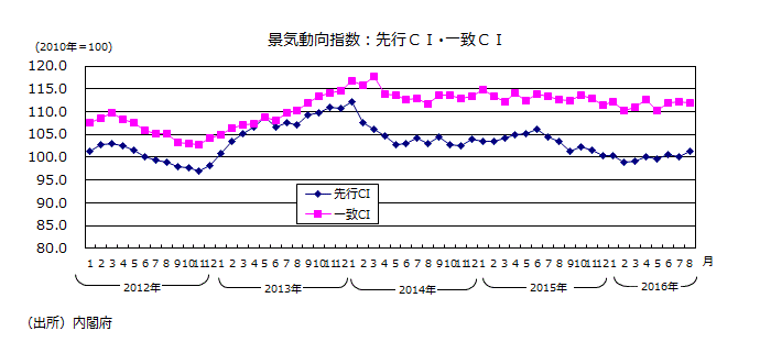 ●最近の一致CIを使った景気の基調判断をみると、14年12月分で、「改善を示している。ただし、基調判断に用いている3カ月後方移動平均のこのところの変化幅は、大きいものではない」に「下方への局面変化」から上方修正された。「下方への局面変化」から「改善を示している」に戻るのは異例のパスということだった。15年1月分で、但し書きは消えて、「改善を示している」という判断継続になった。15年2月分~4月分でも、「改善を示している」という判断継続になったが、5月分で景気拡張の動きが足踏み状態になっている可能性が高いことを示す「足踏みを示している」に下方修正され、15年6月分~16年8月分でも判断据え置きで、1年4カ月もの間、同じ判断が続いている。