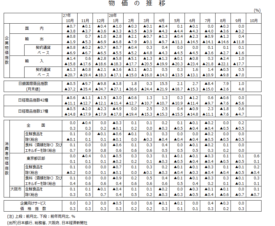 ●10月分の生鮮食品を除く総合の前年同月比は、東京都区部(速報)は▲0.4%で9月分の▲0.5%から下落率が縮小したが8カ月連続の下落になった。10月分の前月比は+0.2%だった。大阪市の生鮮食品を除く総合の10月分前年同月比は▲0.7%と9月分と同じ下落率だった。10月分の前月比は+0.1%だった。
