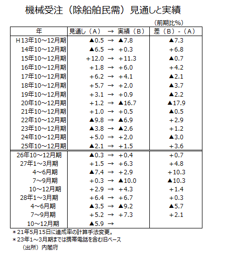 ●内閣府の基調判断は、16年5月分で「機械受注は、足踏みがみられる」へと8カ月ぶりに下方修正となった。6月分も「機械受注は、足踏みがみられる」で判断据え置きになった。しかし、7月分では内容がしっかりしていることを受けて「機械受注は、持ち直しの動きがみられる」になった。3カ月ぶりに「持ち直し」の表現が使われた。基調判断の上方修正は15年10月分以来9カ月ぶりであった。8月分でも基調判断は据え置かれ「機械受注は、持ち直しの動きがみられる」に据え置かれていたが、今回9月分では2カ月連続減少になったことなどから、「機械受注は、持ち直しの動きに足踏みがみられる」に2カ月ぶりに判断修正、4カ月ぶりの下方修正となった。