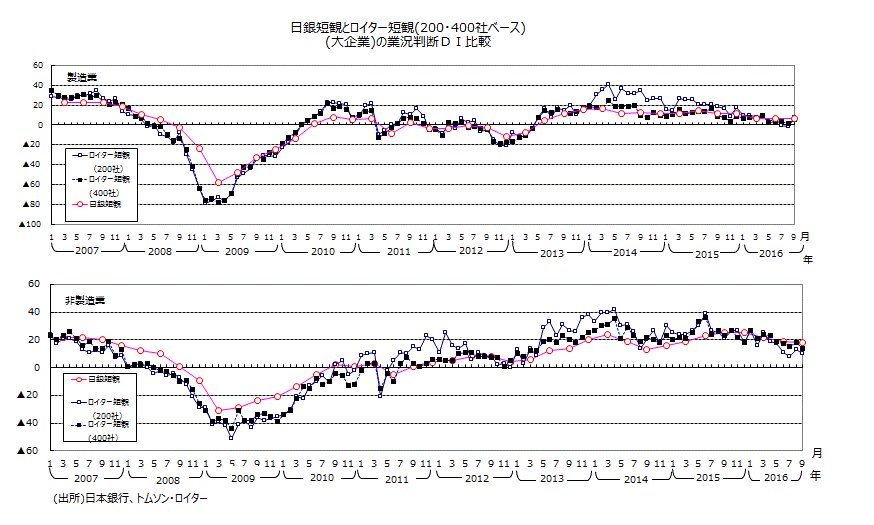 ●大企業・製造業で「悪い」と答えた割合は16年3月調査・6月調査とも10%だったが、今回9月調査で9%と1ポイント低下した。
