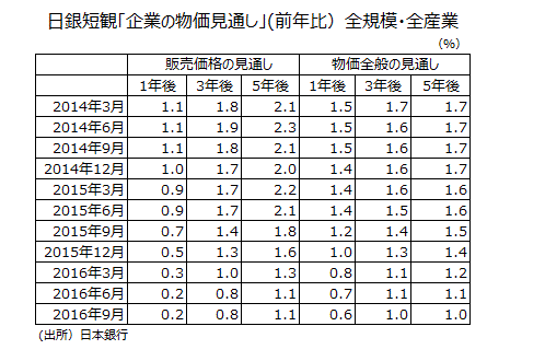 ●10月4日に発表された「企業の物価見通し」によると、全規模・全産業ベースの販売価格見通しの平均は、1年後が+0.2%、3年後+0.8%、5年後+1.1%と6月調査と同じであった。14年9月調査から続いてきた販売価格見通しの下落基調が3年ぶりに止まった。