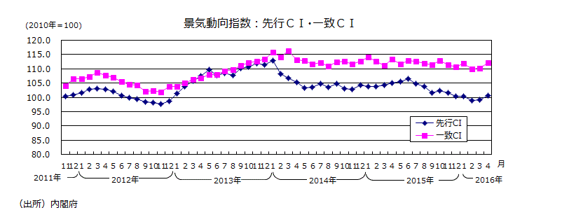 ●最近の一致CIを使った景気の基調判断をみると、14年12月分で、「改善を示している。ただし、基調判断に用いている3カ月後方移動平均のこのところの変化幅は、大きいものではない」に「下方への局面変化」から上方修正された。「下方への局面変化」から「改善を示している」に戻るのは異例のパスということだった。15年1月分で、但し書きは消えて、「改善を示している」という判断継続になった。15年2月分~4月分でも、「改善を示している」という判断継続になったが、5月分で景気拡張の動きが足踏み状態になっている可能性が高いことを示す「足踏みを示している」に下方修正され、15年6月分~16年4月分でも判断据え置きで、1年間同じ判断となった。