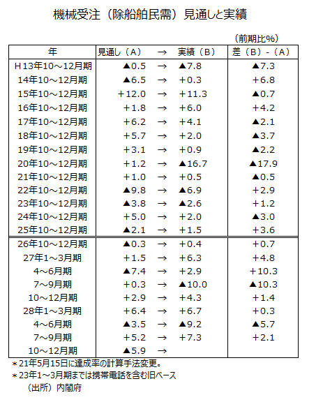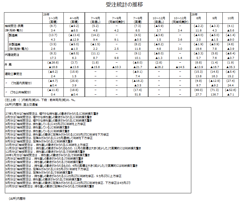 ●内閣府の基調判断は、16年5月分で「機械受注は、足踏みがみられる」へと8カ月ぶりに下方修正となった。6月分も「機械受注は、足踏みがみられる」で判断据え置きになった。しかし、7月分では内容がしっかりしていることを受けて「機械受注は、持ち直しの動きがみられる」になった。3カ月ぶりに「持ち直し」の表現が使われた。基調判断の上方修正は15年10月分以来9カ月ぶりであった。8月分でも基調判断は据え置かれ「機械受注は、持ち直しの動きがみられる」に据え置かれていたが、前回9月分では2カ月連続減少になったことなどから、「機械受注は、持ち直しの動きに足踏みがみられる」に2カ月ぶりに判断修正、4カ月ぶりの下方修正となった。今回10月分では3カ月移動平均が低下傾向にあるため、「機械受注は、持ち直しの動きに足踏みがみられる」に据え置きになった。