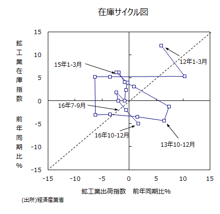 ●大きな動きをチェックするために、鉱工業全体で縦軸に在庫の前年比を、横軸に出荷の前年比をとった在庫サイクル図をみると14年1~3月期では、出荷の前年比が+7.4%、在庫が同▲1.2%、と45度線を下回っていた。しかし、14年4~6月期では、在庫が前年同期比増加に転じ、出荷の前年比が+0.9%、在庫が同+3.1%、と45度線を上回ってしまい、在庫積み上がり局面に入った。15年10~12月期では、出荷の前年比が▲0.8%、在庫が同0.0%、と近づいたものの45度線をやや上回った。それ以降16年4~6月分(出荷の前年比が▲2.0%、在庫が同0.0%)までは45度線を上回ったままだった。16年7~9月期で出荷の前年比が▲0.6%、在庫が同▲2.0%と45度線を下回った。10~12月期では出荷の前年比が+1.7%、在庫が同▲5.0%とさらに右下に動いた。現在、在庫循環図からみて、生産が増加しやすい意図せざる在庫減局面に入っていると言えよう。