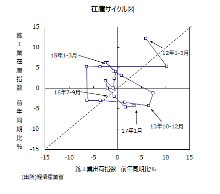 ●大きな動きをチェックするために、鉱工業全体で縦軸に在庫の前年比を、横軸に出荷の前年比をとった在庫サイクル図をみると14年1~3月期では、出荷の前年比が+7.4%、在庫が同▲1.2%、と45度線を下回っていた。しかし、14年4~6月期では、在庫が前年同期比増加に転じ、出荷の前年比が+0.9%、在庫が同+3.1%、と45度線を上回ってしまい、在庫積み上がり局面に入った。15年10~12月期では、出荷の前年比が▲0.8%、在庫が同0.0%、と近づいたものの45度線をやや上回った。それ以降16年4~6月分(出荷の前年比が▲2.0%、在庫が同0.0%)までは45度線を上回ったままだった。16年7~9月期で出荷の前年比が▲0.6%、在庫が同▲2.0%と45度線を下回った。10~12月期では出荷の前年比が+1.7%、在庫が同▲4.6%とさらに右下に動いた。17年1月分では出荷の前年比が+3.5%、在庫が同▲4.3%となった。現在、在庫循環図からみて、生産が増加しやすい「意図せざる在庫減局面」に入っていると言えよう。