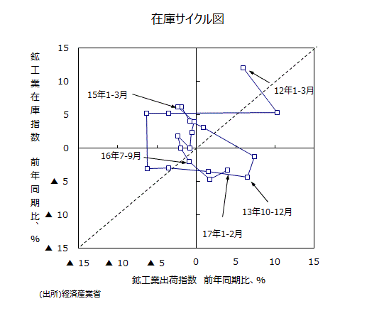 ●大きな動きをチェックするために、鉱工業全体で縦軸に在庫の前年比を、横軸に出荷の前年比をとった在庫サイクル図をみると、15年10~12月期では、出荷の前年比が▲0.8%、在庫が同0.0%、と近づいたものの45度線をやや上回った。それ以降16年4~6月分(出荷の前年比が▲2.0%、在庫が同0.0%)までは45度線を上回ったままだった。16年7~9月期で出荷の前年比が▲0.6%、在庫が同▲2.0%と45度線を下回った。10~12月期では出荷の前年比が+1.7%、在庫が同▲4.6%とさらに右下に動いた。17年1~2月分では出荷の前年比が+4.0%、在庫が同▲3.3%となった。現在、在庫循環図からみて、生産が増加しやすい「意図せざる在庫減局面」に入っていると言えよう。