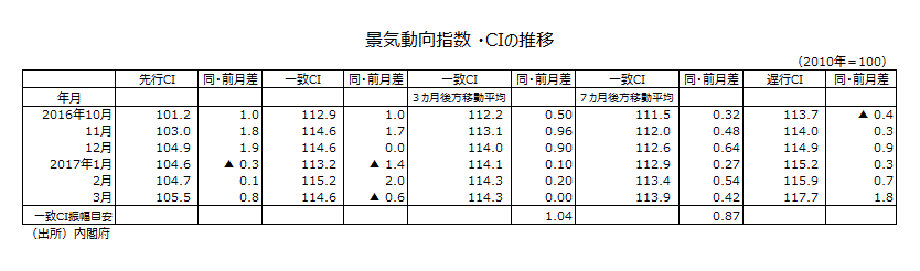●一致CIを使った景気の基調判断をみると、15年5月分~16年9月分の1年5カ月間もの間、景気拡張の動きが足踏み状態になっている可能性が高いことを示す「足踏みを示している」という同じ基調判断が続いていたが、16年10月分で「改善を示している」に上方修正された。その後11月分・12月分・17年1月分・2月分と同じ基調判断だった。今回3月分も「改善を示している」で6カ月連続して最高の判断が続いている。