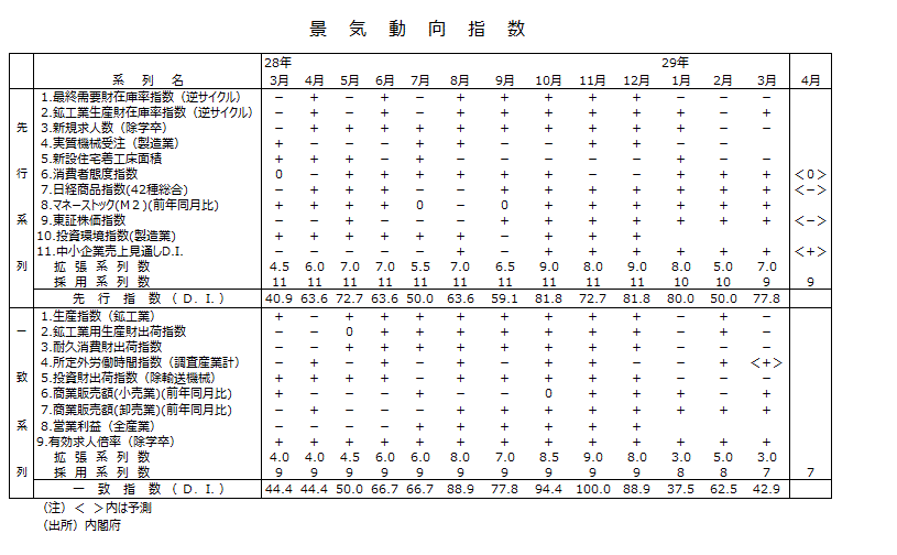 ●また、4月分の先行DIでは、数値が判明している消費者態度指数、日経商品指数、東証株価指数、中小企業売上げ見通しDIの4系列でプラス符号は中小企業売上げ見通しDI・1系列、保合いが消費者態度指数1系列、マイナス符号は日経商品指数、東証株価指数2系列と判明している。4月分速報値段階の先行DIは16.7%以上72.2%以下が確定している。