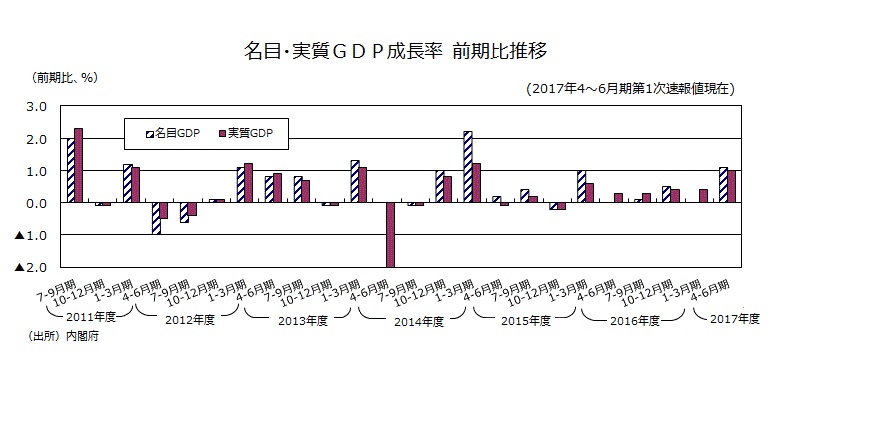 ●17年4~6月期実質GDP成長率・第1次速報値は前期比+1.0%、前期比年率+4.0%となった。プラス成長は6四半期連続で、戦後最長の「いざなみ景気」の後半の時期にあたる05年1~3月期から06年4~6月期の6四半期連続以来、11年ぶりだ。
