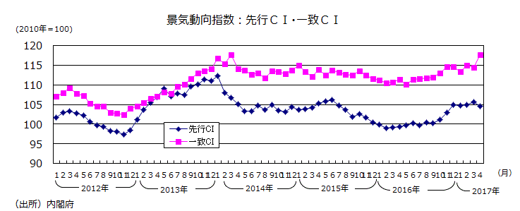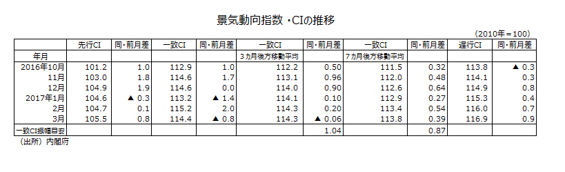 ●一致CIを使った景気の基調判断をみると、15年5月分~16年9月分の1年5カ月間もの間、景気拡張の動きが足踏み状態になっている可能性が高いことを示す「足踏みを示している」という同じ基調判断が続いていたが、16年10月分で「改善を示している」に上方修正された。その後11月分・12月分・17年1月分・2月分・3月分と同じ基調判断だった。今回4月分も「改善を示している」で7カ月連続して最高の判断が続いている。