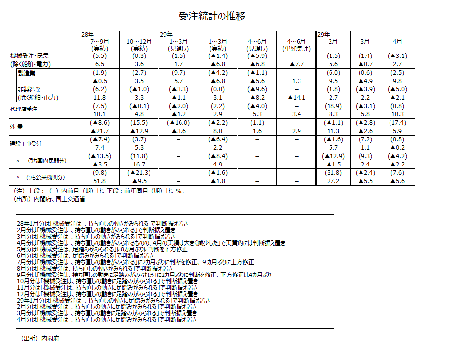 ●内閣府の基調判断は、16年9月分で「機械受注は、持ち直しの動きに足踏みがみられる」に下方修正となった。その後16年10月分・11月分・12月分・17年1月分・2月分・3月分に続き今回4月分でも、「機械受注は、持ち直しの動きに足踏みがみられる」に8カ月連続据え置きになった。