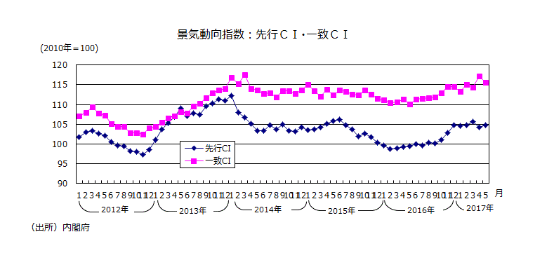 ●一致CIを使った景気の基調判断をみると、15年5月分~16年9月分の1年5カ月間もの間、景気拡張の動きが足踏み状態になっている可能性が高いことを示す「足踏みを示している」という同じ基調判断が続いていたが、16年10月分で「改善を示している」に上方修正された。その後11月分・12月分・17年1月分・2月分・3月分・4月分と同じ基調判断だった。今回5月分も「改善を示している」で8カ月連続して最高の判断が続いている。