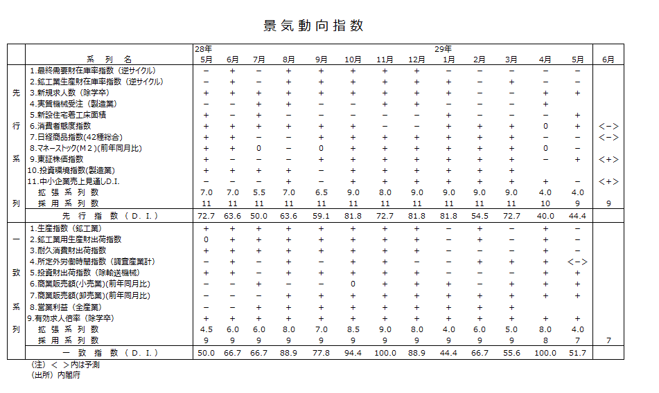 ●また、6月分の先行DIでは、数値が判明している消費者態度指数、日経商品指数、東証株価指数、中小企業売上げ見通しDIの4系列でプラス符号は東証株価指数、中小企業売上げ見通しDIの2系列、マイナス符号は消費者態度指数、日経商品指数DIの2系列と判明している。6月分速報値段階の先行DIは22.2%以上77.8%以下が確定している。