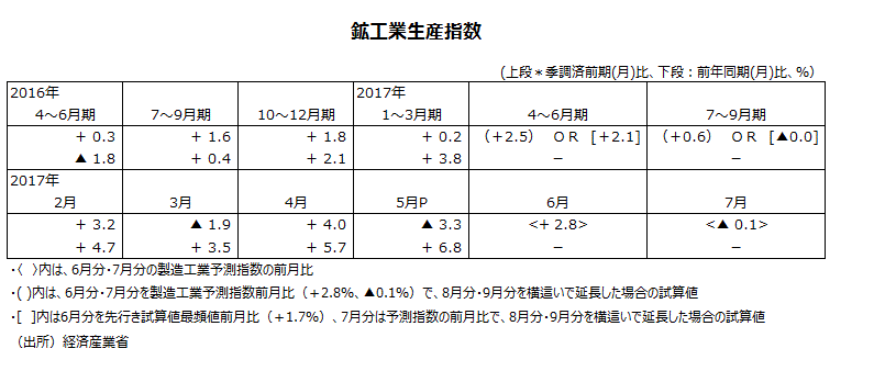 ●先行きの鉱工業生産指数6月分を製造工業予測指数前月比(+2.8%)で延長した場合、4~6月期の前期比は+2.5%の増加になる見込みだ。一方、6月分を先行き試算値最頻値前月比(+1.7%)で延長した場合は4~6月期の前期比は+2.1%の増加になる見込みだ。16年4~6月期以降17年4~6月期にかけ前期比プラスは5四半期連続になりそうだ。