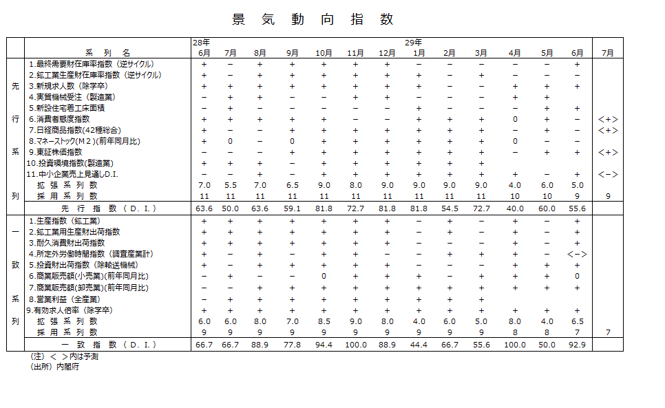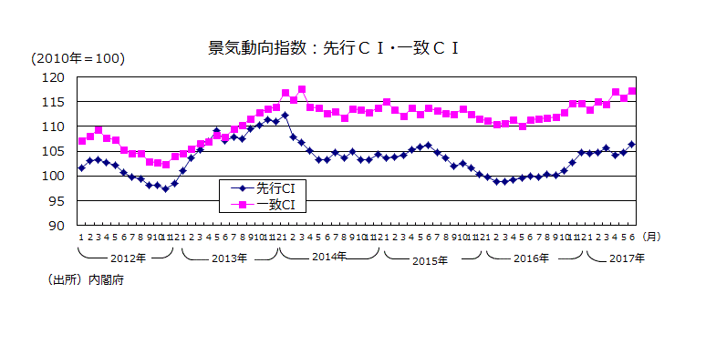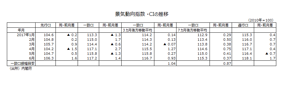 ●一致CIを使った景気の基調判断をみると、15年5月分~16年9月分の1年5カ月間もの間、景気拡張の動きが足踏み状態になっている可能性が高いことを示す「足踏みを示している」という同じ基調判断が続いていたが、16年10月分で「改善を示している」に上方修正された。その後11月分・12月分・17年1月分・2月分・3月分・4月分・5月分と同じ基調判断だった。今回6月分も「改善を示している」で9カ月連続して最高の判断が続いている。