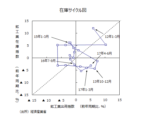 ●大きな動きをチェックするために、鉱工業全体で縦軸に在庫の前年比を、横軸に出荷の前年比をとった在庫サイクル図をみると、16年4~6月期(出荷の前年比が▲1.9%、在庫が同▲0.5%)までは45度線を上回ったままだった。16年7~9月期で出荷の前年比が▲0.5%、在庫が同▲2.7%と45度線を下回った。10~12月期では出荷の前年比が+1.8%、在庫が同▲5.3%とさらに右下に動いた。17年1~3月期では出荷の前年比が+3.7%、在庫が同▲4.0%と、1~3月期まで生産が増加しやすい「意図せざる在庫減局面」に入っていた。17年4~6月期では出荷の前年比が+5.1%、在庫が同▲3.1%に動いた。現在、在庫サイクル図からみて、「在庫積み増し局面」に入ったと言えよう。