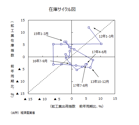 ●大きな動きをチェックするために、鉱工業全体で縦軸に在庫の前年比を、横軸に出荷の前年比をとった在庫サイクル図をみると、16年4~6月期(出荷の前年比が▲1.9%、在庫が同▲0.5%)までは45度線を上回ったままだった。16年7~9月期で出荷の前年比が▲0.5%、在庫が同▲2.7%と45度線を下回った。10~12月期では出荷の前年比が+1.8%、在庫が同▲5.3%とさらに右下に動いた。17年1~3月期では出荷の前年比が+3.7%、在庫が同▲4.0%と、1~3月期まで生産が増加しやすい「意図せざる在庫減局面」に入っていた。17年4~6月期では出荷の前年比が+5.2%、在庫が同▲2.9%になり、在庫サイクル図からみて、「在庫積み増し局面」に入った。17年7~8月では出荷の前年比が+4.9%、在庫が同▲3.0%になった。