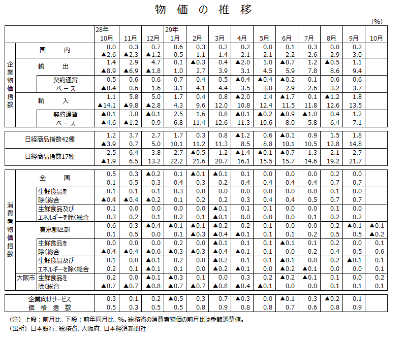 ●10月分の生鮮食品を除く総合の前年同月比は、東京都区部(速報)は+0.6%と9月分の+0.5%から若干上昇率を高めた。4カ月連続の上昇だ。大阪市の生鮮食品を除く総合の10月分前年同月比は+0.1%で9月分と同じになった。3カ月連続の上昇だ。
