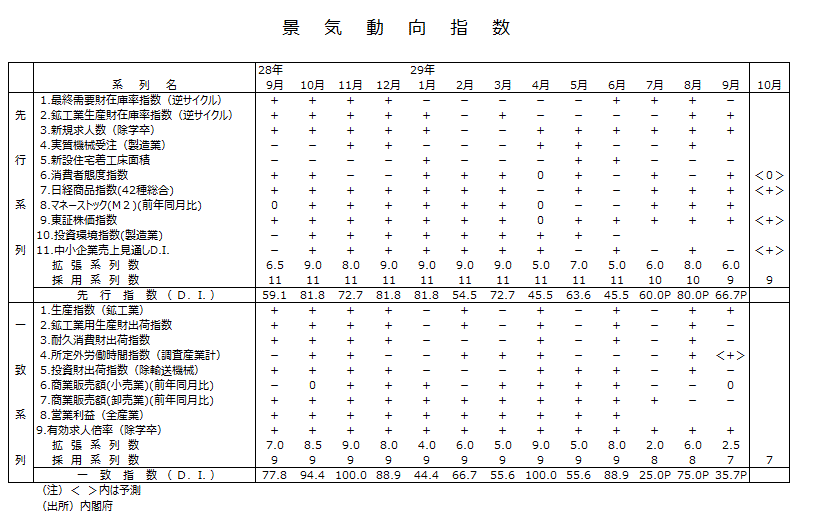 ●また、10月分の先行DIでは、数値が判明している消費者態度指数、日経商品指数、東証株価指数、中小企業売上げ見通しDIの4系列でプラス符号は日経商品指数、東証株価指数、中小企業売上げ見通しDIの3系列、保合いは、消費者態度指数1系列と判明している。10月分速報値段階の先行DIは38.9%以上94.4%以下が確定している。