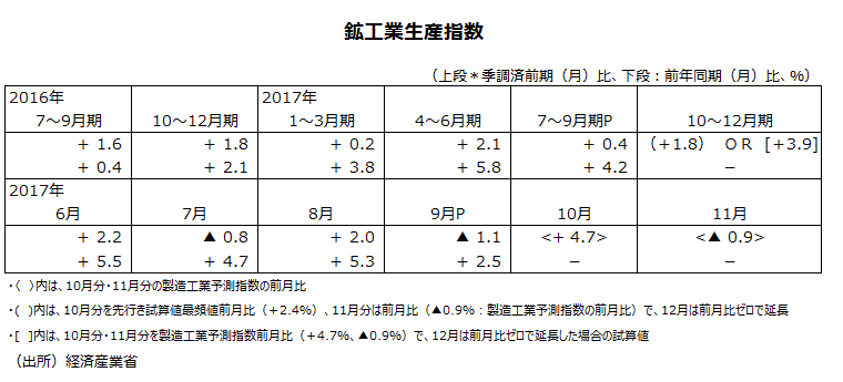 ●先行きの鉱工業生産指数9月分を製造工業予測指数前月比(+4.7%)で延長し、11月分を製造工業予測指数前月比(▲0.9%)で、12月分を前月比ゼロで延長した場合は10~12月期の前期比は+3.9%の増加になる見込みだ。17年10~12月期まで7四半期連続前期比プラスになる可能性が大きいと考えられる。