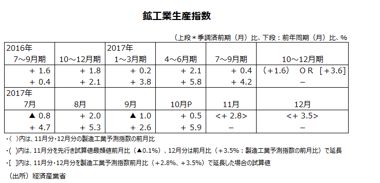 ●先行きの鉱工業生産指数10月分を製造工業予測指数前月比(+2.8%)で延長し、12月分を製造工業予測指数前月比(+3.5%)で延長した場合は10~12月期の前期比は+3.6%の増加になる見込みだ。11・12月分が横這いでも10~12月期の前期比は+0.5%の増加になる。17年10~12月期まで7四半期連続前期比プラスになる可能性が大きいと考えられる。