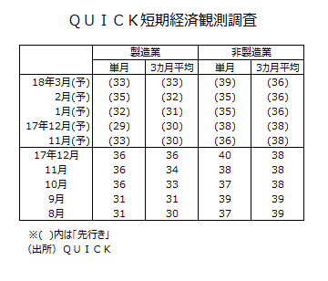 ●QUICK短観12月調査の製造業の3月までの「先行き見通し」は+33で12月実績の+36より3ポイント低下の予想、非製造業の3月までの「先行き見通し」は+39で12月実績の+40から1ポイントの低下予想である。