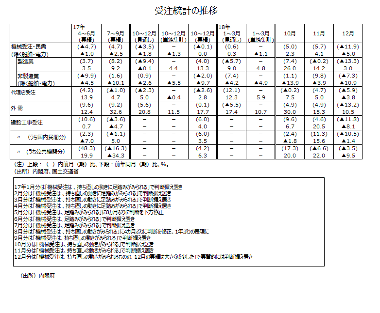 ―内閣府「機械受注は、持ち直しの動きがみられるものの、12月の実績は大きく減少した」で実質的には基調判断を据え置き。