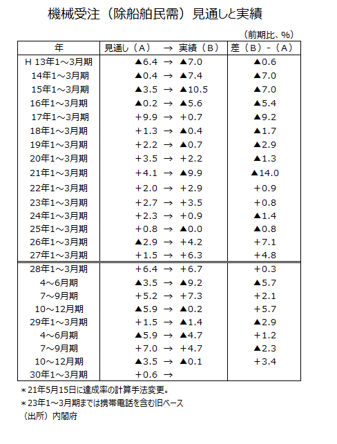 ●機械受注(除船電民需)1~3月期の前期比見通しは+0.6%である。1~3月期の前期比実績はかつて見通しを下振れることが多かったが、見通しに使う達成率の計算方法を変えた10年(平成22年)からの7年間で上振れ4回、下振れ3回とほぼ同じになっている。