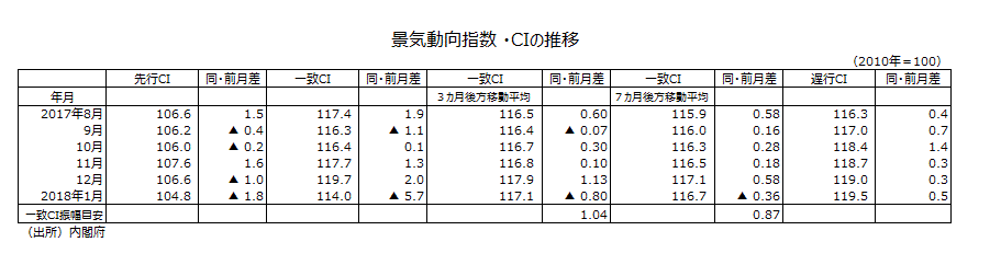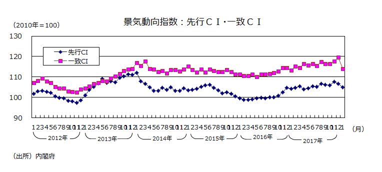 -一致CI指数水準114.0は、17年1月の113.3以来1年ぶりの低い水準-