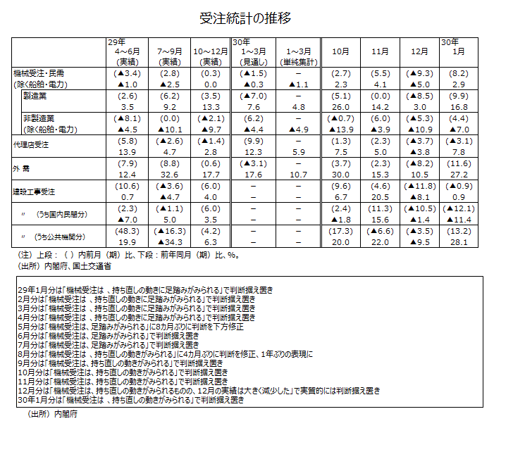 ●内閣府の基調判断は、17年8月分で「機械受注は 、持ち直しの動きがみられる」に4カ月ぶりに判断が上方修正された。「足踏み」という言葉が入らない表現は16年8月分以来、1年ぶりだった。9月分・10月分に続き、11月分でも基調判断は「機械受注は 、持ち直しの動きがみられる」で据え置きになった。前回12月分は、「機械受注は、持ち直しの動きがみられるものの、12月の実績は大きく減少した」で実質的に判断据え置きとなった。こうした表現は16年4月分の「機械受注は 、持ち直しの動きがみられるものの、4月の実績は大きく減少した」以来であった。今回18年1月分では基調判断は「機械受注は 、持ち直しの動きがみられる」で据え置きになった。