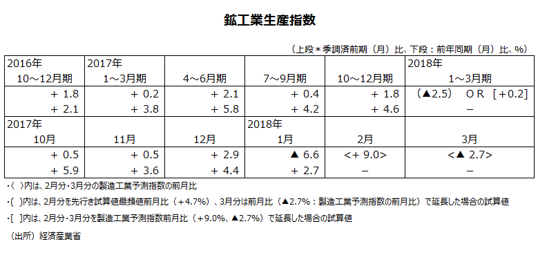 ●先行きの鉱工業生産指数2月分・3月分を製造工業予測指数前月比(+9.0%、▲2.7%)で延長した場合は1~3月期の前期比は+0.2%とかろうじて増加になるが、87年7~9月期から89年4~6月期までの8四半期連続以来28年9カ月ぶりの連続記録達成はハードルが高そうだ。