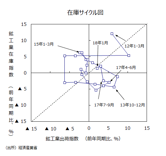 ●大きな動きをチェックするために、鉱工業全体で縦軸に在庫の前年比を、横軸に出荷の前年比をとった在庫サイクル図をみると、17年1~3月期では出荷の前年比が+3.7%、在庫が同▲4.0%と、1~3月期まで生産が増加しやすい「意図せざる在庫減局面」に入っていた。17年4~6月期では出荷の前年比が+5.2%、在庫が同▲2.9%になり、在庫サイクル図からみて、「在庫積み増し局面」に入った。17年7~9月期では出荷の前年比が+3.7%、在庫が同▲2.4%だった。17年10~12月期では出荷の前年比が+3.0%、在庫が同+2.1%、18年1月分では出荷の前年比が+2.1%、在庫が同+1.4%で、引き続き「在庫積み増し局面」にある状況だ。