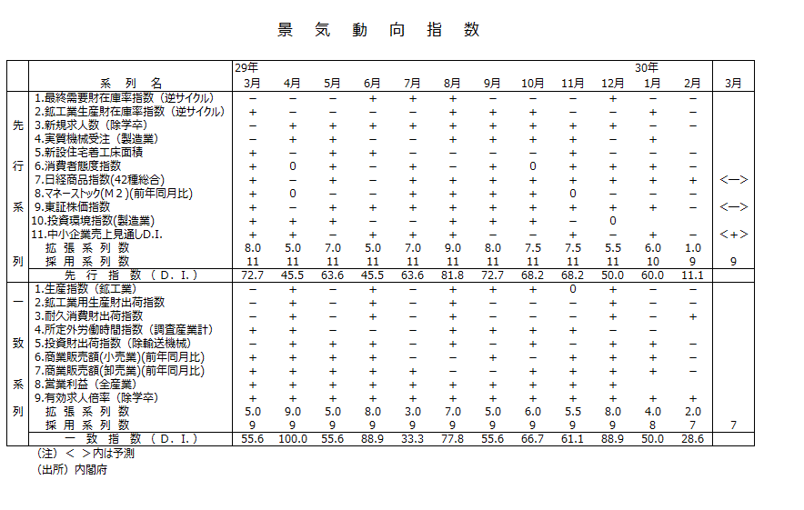 ●また、3月分の先行DIでは、数値が判明している日経商品指数、東証株価指数、中小企業売上げ見通しDIの4系列の中で、中小企業売上げ見通しDI1系列がプラス符号に、日経商品指数、東証株価指数の2系列がマイナス符号になることが判明している。3月分速報値段階の先行DIは11.1%以上77.8%以下が確定している。