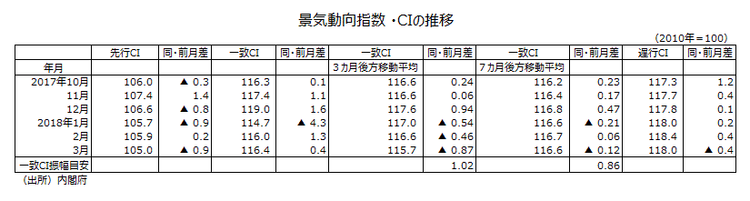 -基調判断18カ月連続「改善」、但し一致CI3カ月移動平均3カ月連続下降-