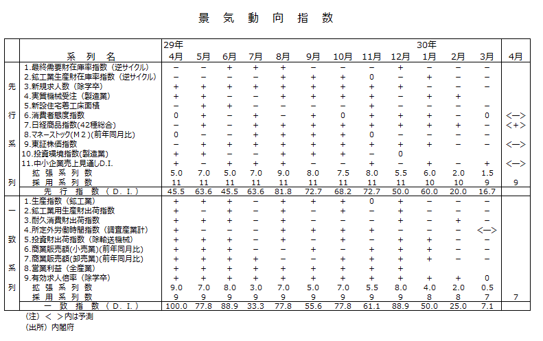 ●また、4月分の先行DIでは、数値が判明している消費者態度指数、日経商品指数、東証株価指数、中小企業売上げ見通しDIの4系列の中で、日経商品指数1系列がプラス符号に、消費者態度指数、東証株価指数、中小企業売上げ見通しDIの3系列がマイナス符号になることが判明している。4月分速報値段階の先行DIは11.1%以上66.7%以下が確定している。