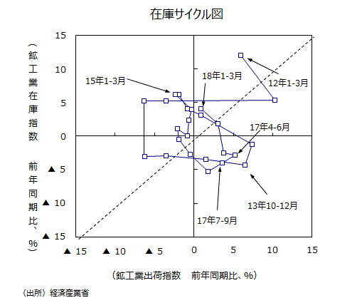●大きな動きをチェックするために、鉱工業全体で縦軸に在庫の前年比を、横軸に出荷の前年比をとった在庫サイクル図をみると、17年1~3月期では出荷の前年比が+3.7%、在庫が同▲4.0%と、1~3月期まで生産が増加しやすい「意図せざる在庫減局面」に入っていた。17年4~6月期では出荷の前年比が+5.2%、在庫が同▲2.9%になり、在庫サイクル図からみて、「在庫積み増し局面」に入った。17年7~9月期では出荷の前年比が+3.7%、在庫が同▲2.4%だった。17年10~12月期では出荷の前年比が+3.0%、在庫が同+2.1%と「在庫積み増し局面」だった。18年1~3月期では出荷の前年比が+0.9%、在庫が同+4.1%と「在庫積み上がり局面」に入ってきた。4~6月期で戻りの動きが出るかどうか要注目だ。