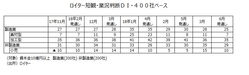 ●一方、ロイター短観3月調査の6月までの「先行き見通し」は、製造業・400社ベースで+25と3月実績の+28から3ポイント低下見込み、製造業・200社ベースで+22と3月実績の+27から4ポイント低下見込み、非製造業・400社ベースの6月までの「先行き見通し」は+29と、3月実績の+35から6ポイントの低下予想、非製造業・200社ベースの6月までの「先行き見通し」は+23と、3月実績の+34から11ポイントの低下予想である。