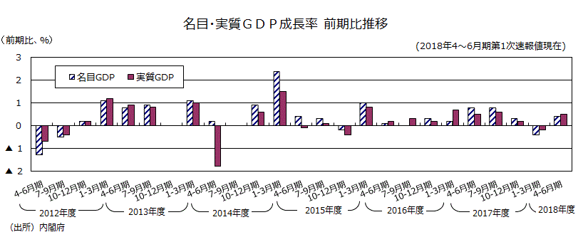 ●18年4~6月期実質GDP成長率・第1次速報値は前期比+0.5%、前期比年率+1.9%となった。1~3月期に寒波・大雪の影響などでマイナスに落ち込んだ実質個人消費が持ち直し、実質設備投資も堅調だったことで2四半期ぶりにプラス成長になった。
