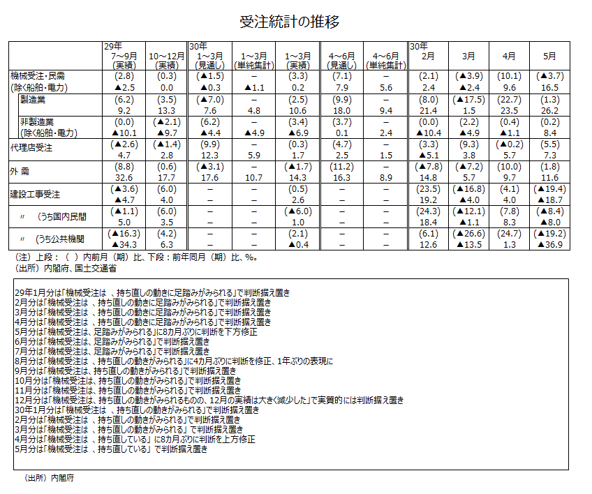 ●18年1月分~3月分では基調判断は「機械受注は、持ち直しの動きがみられる」で据え置きになった。前回4月分では基調判断は「機械受注は、持ち直している」に8カ月ぶりに判断が上方修正された。今回5月分では基調判断は「機械受注は、持ち直している」で据え置きになった。