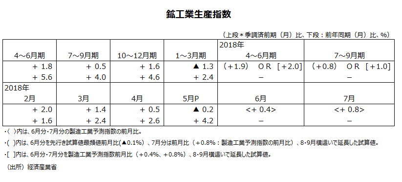 -5月分鉱工業生産指数前月比▲0.2%4カ月ぶり減少。前年比は19カ月連続増加-