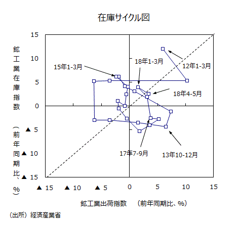 ●18年1~3月期では出荷の前年比が+1.5%、在庫が同+3.9%と「在庫積み上がり局面」に入っていたが、18年4~5月分では出荷の前年比が+3.4%、在庫が同+2.5%と「在庫積み増し局面」に戻った。