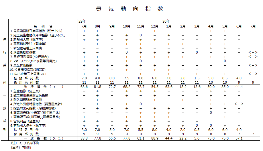 ●また、7月分の先行DIでは、数値が判明している消費者態度指数、日経商品指数、東証株価指数、中小企業売上げ見通しDIの4系列中、消費者態度指数、中小企業売上げ見通しDIの2系列がプラス符号に、日経商品指数、東証株価指数の2系列がマイナス符号になることが判明している。7月分速報値段階の先行DIは22.2%以上77.8%以下が確定している。