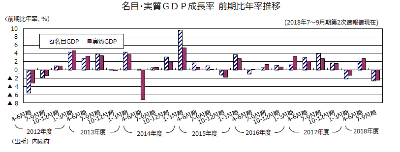 ●18年7~9月期実質GDP成長率・第2次速報値は前期比▲0.6%、前期比年率▲2.5%となった。第1次速報値の前期比▲0.3%、前期比年率▲1.2%から下方修正となった。マイナス成長は2四半期ぶりだ。