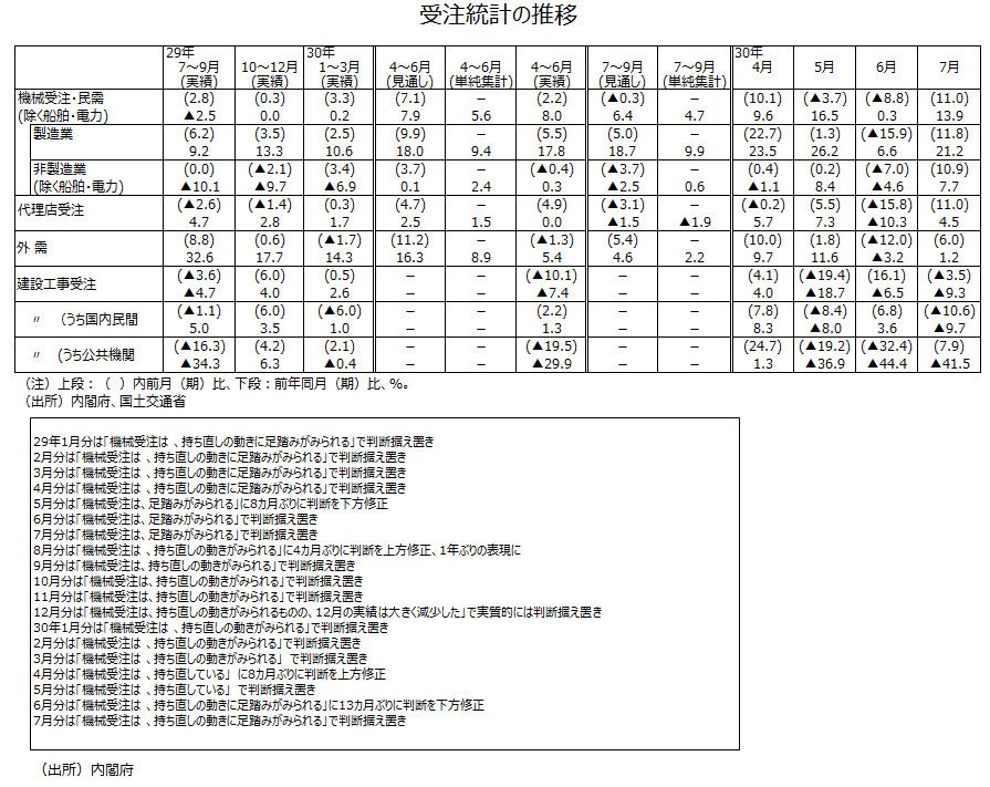 ●18年1月分~3月分では基調判断は「機械受注は、持ち直しの動きがみられる」で据え置きになった。4月分では基調判断は「機械受注は、持ち直している」に8カ月ぶりに判断が上方修正された。5月分では基調判断は「機械受注は、持ち直している」で据え置きになった。前回6月分では3カ月移動平均は6カ月ぶりに下落したことなどから「機械受注は、持ち直しの動きに足踏みがみられる」に13カ月ぶりの下方修正になった。今回7月分でも「機械受注は、持ち直しの動きに足踏みがみられる」と判断据え置きになった。3カ月移動平均は2カ月連続で下落した。