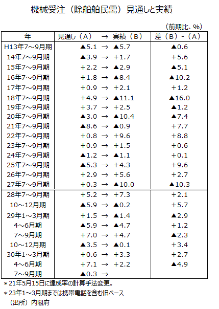 ●機械受注(除船電民需)7~9月期の前期比見通しは▲0.3%。7~9月期の前期比実績は見通しに使う達成率の計算方法を変えた09年(平成21年)からの9年間で上振れ7回、下振れ2回となっている。18年(平成30年)の見通しは単純集計値に過去3四半期平均の達成率101.6をかけたものである。▲0.3%達成には、8・9月の前月比が各々▲3.0%で達成できる。8・9月の前月比が各々▲2.8%で7~9月期の前期比実績は横這いで見通しより上振れる。7月分の数字からは上振れの可能性が高まったようだ。