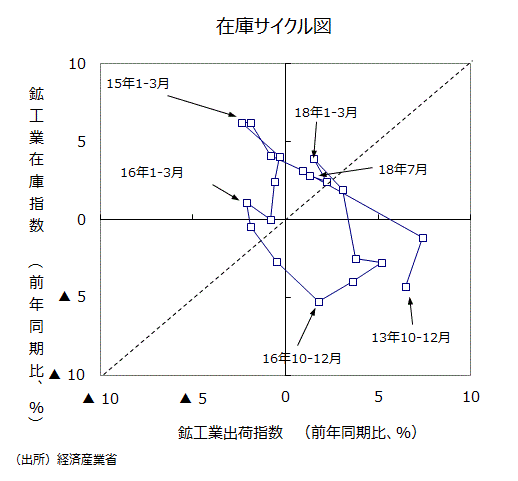 ●18年1~3月期では出荷の前年比が+1.5%、在庫が同+3.9%と「在庫積み上がり局面」に入っていたが、18年4~6月期も出荷の前年比が+2.2%、在庫が同+2.4%と、「在庫積み増し局面」には戻れずに「在庫積み上がり局面」のままになった。18年7月も出荷の前年比が+1.3%、在庫が同+2.8%と「在庫積み上がり局面」である。