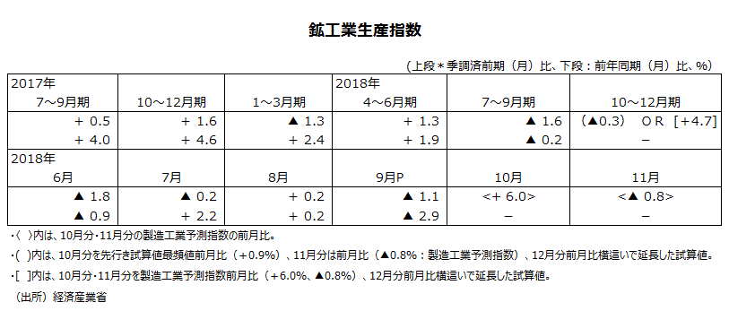 -9月分鉱工業生産指数前月比▲1.1%と2カ月ぶり減少、前年同月比3カ月ぶりに減少-