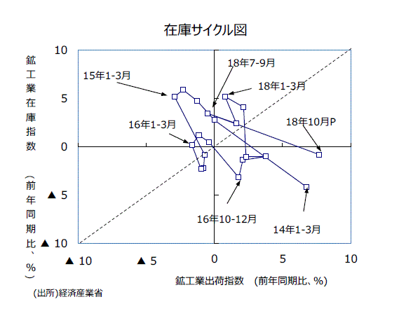 ●18年4~6月期も出荷の前年同期比が+1.6%、在庫が同+2.4%、18年7~9月期も出荷の前年同期比が▲0.5%、在庫が同+3.5%と「在庫積み上がり局面」であったが、18年10月では出荷の前年同月比が+7.7%、在庫が同▲0.8%と「在庫積み増し局面」に戻った。